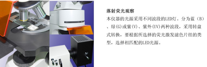 落射荧光照明系统 | 5W 高亮单色LED,可以按单色或双色进行组合,各单色LED发光波长为:绿色475nm~550nm 发射波长595nm; 蓝色410nm~490nm,发射波长:515nm | |||